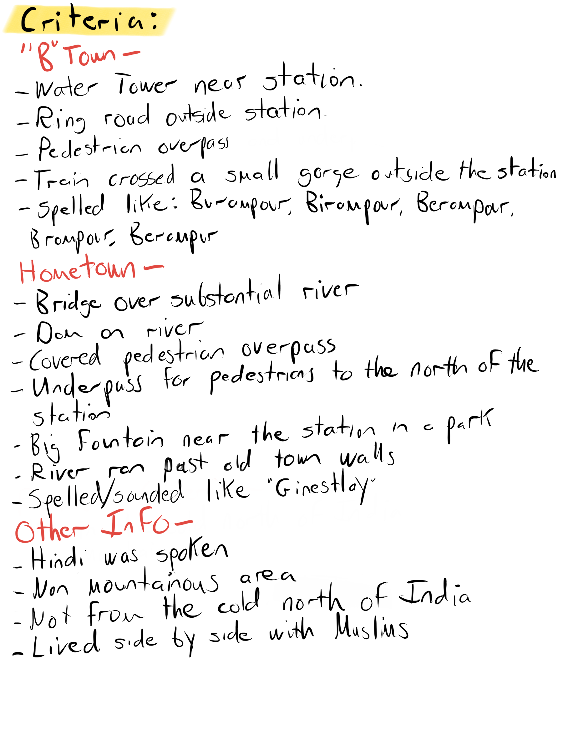 I kept very careful notes whilst I was reading the book and below is an exhaustive list of the criteria that he would follow from his recollections from his five year old self. The criteria is both from his hometown and the town that began with ‘B’ where he got on the train that eventually took him to Kolkata.