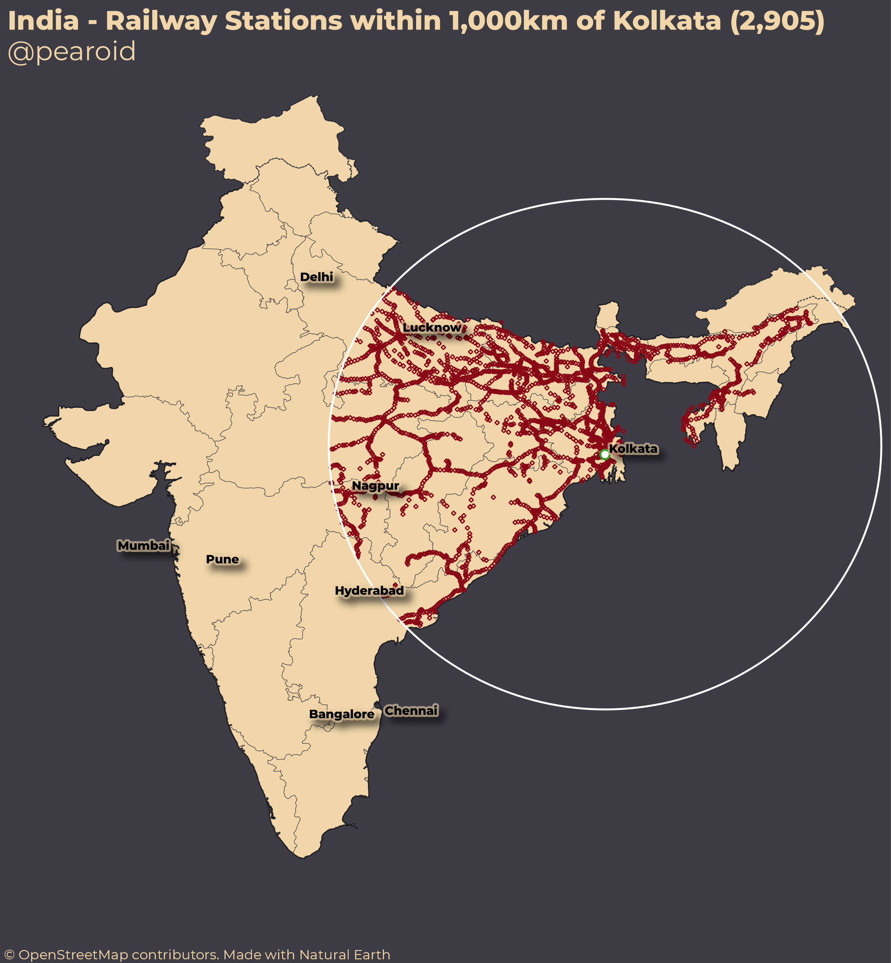 I used the Osmium tool to extract every railway station and line in India and then GDAL to convert them to the geopackage format. The first analysis I undertook was to follow Saroo’s and ascertain how many railway stations are within 1,000km of Howrah railway station. To give some context, OSM has listed 7,979 railway stations and 108,000km of railway line (the Wikipedia page lists 68,155 km (the discrepancy may be accounted for by in the inclusion of every siding and historic railway line etc. in the OSM data). The below map shows every railway station and line from OSM.